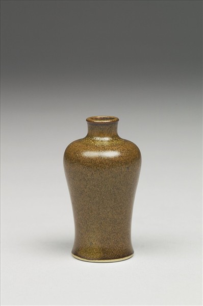 鼻煙壺,作小梅瓶式,器底有圈紋拉坏遺痕。全器施以茶葉末釉裝飾,茶葉末為俗稱,釉色多樣,清宮及景德鎮對其稱為「廠官釉」,一般黃、綠摻雜,黃色多者,又稱「鱔魚黃」等等。