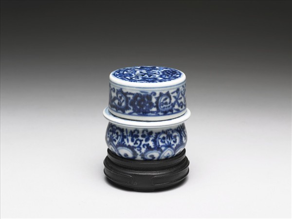 子母口蓋,直頸,頸、腹間有板沿。瓷胎潔白瑩潤,在白釉上的鈷料描繪成各式花卉圖案,燒成後藍彩濃豔,局部出現暈散現象。底露胎,無款,附木座。軸頭罐是一種流行於明、清的新罐式,以形體似卷軸的軸頭而得名。