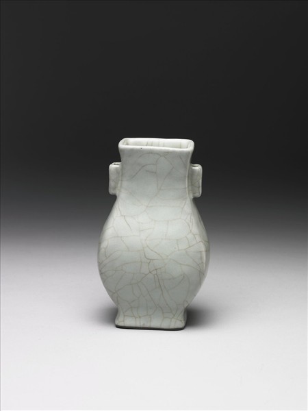 仿銅器貫耳壺形,短頸,兩側各飾一貫耳,碩腹,平底,矮圈足。通體施月白色釉,釉色淺淡,釉面開灰色紋片,施釉至足邊,底面有釉,足緣無釉,加塗黑灰色護胎汁。底面鐫刻乾隆皇帝〈詠官窯雙管瓶〉:「李唐越器久稱無,趙宋官窯珍以孤。色自粉青冺火氣,紋猶鱔血裂冰膚。摩挲真是朴之朴,詠歎仍非觚不觚。合贈何人合長吉,簮花得句負奚奴」御製詩。詩末署「乾隆壬寅御題」紀年銘(乾隆四十七年,1782),並落「太」、「璞」兩枚鈐印。傳世隨附木座,面刻與器相同的御製詩,並落「古香」一枚鈐印。