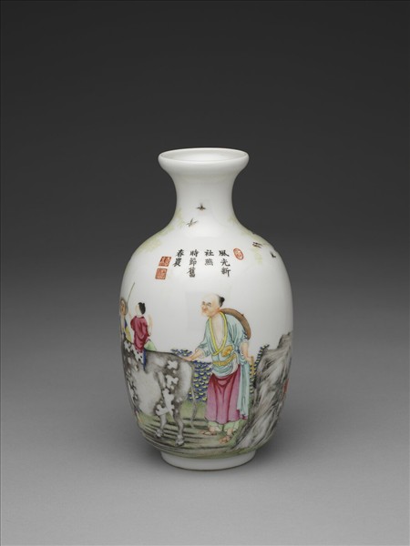 均侈口窄邊,短頸,長腹,矮圈足。薄胎白釉,瓶面彩畫坡陀淺草,桃柳春燕,農夫稚子放牧其間。瓶肩下有墨書題句:「風光新社燕,時節舊春農。」硃紅描繪「仁化」「德高」「志遠」三印。底均有藍料書「乾隆年製」四宋體字款,外加雙方圈。