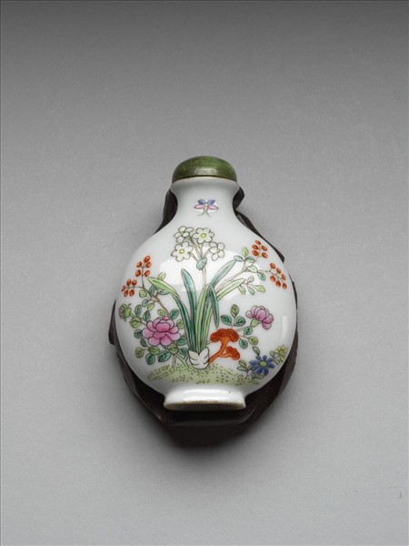 瓷胎扁壺,彩繪水仙、天竹等吉祥花卉,清雅可人。附綠色茜牙蓋與牙匙。原貯於清〈黃花梨嵌寶盒〉百什件,為養心殿之華滋堂、燕喜堂收藏。