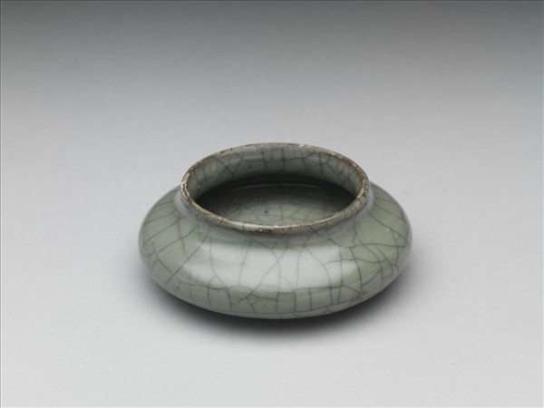 水盂,腹寬而矮,頸微折,敞口、圈足。足圈墊燒,胎面呈紫黑色。通器飾灰青釉,釉中合黑點及黑色細密開片與淺色冰紋,釉面油亮。水盂內殘墨痕。帶白玉勺,勺柄琢繩紋。