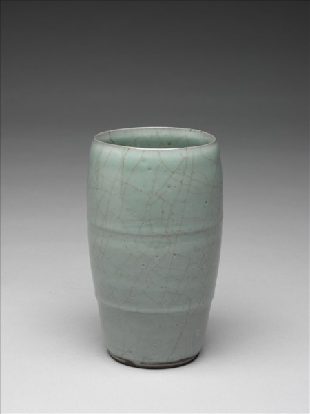 圓筒形,口微內斂,器身微外鼓,腹部以下漸收,器表飾弦紋三道,平底,淺圈足。墊燒,內外施濃釉,呈粉青色,口沿釉薄現出灰色邊,底部有積釉痕。器表開棕色大紋片,間雜細小縮釉點。足端與外底塗黑褐色薄汁,周緣局部沾釉。