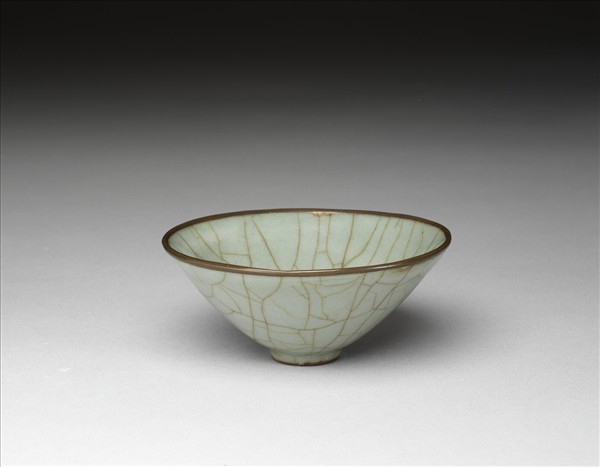 侈圓口,深壁上豐下削,小圓底,矮圈足。青色較深,內外一致。鱔血紋勻整清晰。足底塗赭色汁,口鑲銅邊。