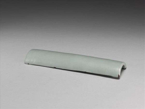 臂擱,形如半剖的竹段,底邊四角微凸。光素,滿施官窯天青釉,釉凝厚溫潤,面有稀疏的淡色紋片,略有縮釉小眼。兩底邊上有細支釘痕四枚。四角無釉露胎呈褐黑色。器底刻乾隆四十二年(1777)隸書提詞︰ 「物有其奇必有偶,乾坤示象義經紐。宋瓷臂擱天府久。茲獲其雙不脛走。瓦形長短同薄厚,鐵足淡青出藍受。後先合德相為友,官窯脩內陶成後。瘦金筆法擱臂肘,義之懸腕或弗取。此理倩誰為判剖,文良雅玩堪享帚。那數琅玕瓊瑤玖。卵幕杯祗盛醴酒,小哉浮梁昊十九。乾隆丁酉新春月上澣御題。」印「乾」、「隆」。