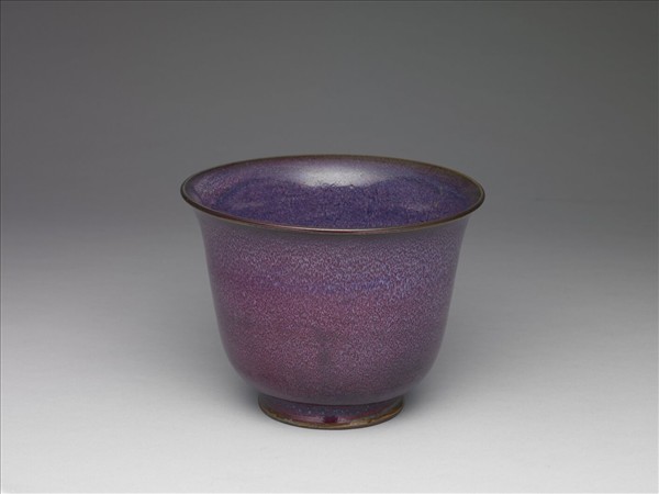 此盆形如仰放的掛鐘,微撇口,深直壁,微斂,矮圈足,底挖滲水孔五個,周圍壁薄,圈足壁厚。全器通體施濃釉,釉面勻亮,口沿呈褐色邊。外壁呈天藍葡萄紫紅色,淺藍釉面浮出紫或紅色彩斑,施釉至足際,足邊修釉齊整,露胎處塗醬色釉汁。底部陰刻「九」。