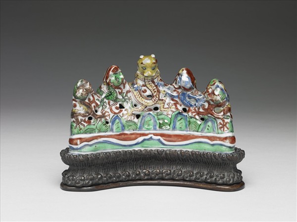 瓷製筆架,呈五山峰形狀,全器佈滿不規則孔。底施白釉,五座山頭各繪有一褐、綠、黃、藍、紅龍首,龍身延至筆架後方與下方。龍身下方繪藍綠相間之綿延山峰。此器勾勒線條率性奔放,用色活潑生動,與一般瓷器風格迥異。附木座。