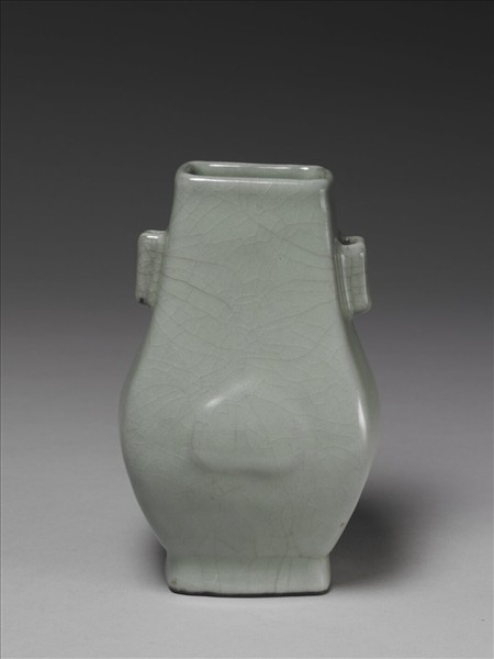 四方貫耳壺形,長頸,兩側各飾一貫耳,碩腹,腹部兩面各鼓起一杏葉裝飾,平底,矮圈足。通體施粉青色釉,釉薄處現出灰色邊,施釉至足邊,底面有釉,足緣無釉,加塗黑灰色護胎汁。底面鐫刻乾隆皇帝詠〈鈞窯雙耳瓶〉:「耳雙穿組提攜便,脩內當時位置宜。欲問宣和精物理,達聰虞訓可曾思」御製詩。詩末署「乾隆辛亥春日御題」紀年銘(乾隆五十六年:1791),並落「古香」、「太璞」兩枚鈐印。傳世隨附木座(故瓷018051N000000001),面刻與器相同的御製詩,詩末落「比德」和「朗潤」兩枚鈐印。這件作品分明為青瓷,然而乾隆皇帝卻降旨刻題〈鈞窯雙耳瓶〉,究否為誤植,還是反映出另一個鈞、汝不分的案例。猶待未來研究進一步確認。