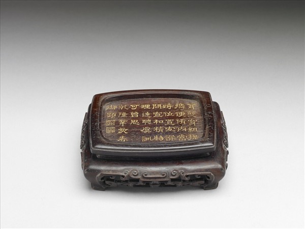 深棕色木座,與青瓷杏葉貫耳壺(故瓷018051-N000000000)為一組,由兩部分組成。長方形座上層透空以放置木板,底帶四足。四足之間有欄相接,鏤雕幾何紋。長方形木板四周起邊框,可置於下層方形座間,器壁光素無紋。板面書金字隸書御製詩文:「耳雙穿組提攜便,內脩當時位置宜。欲問宣和精物理,達聰虞訓可曾思。乾隆辛亥春御題」。