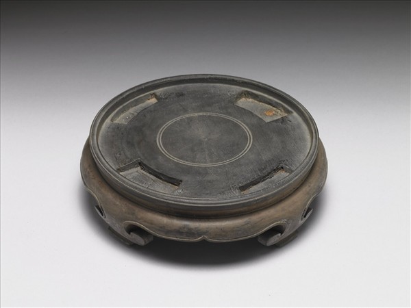 深色圓形木座,上層為灰黑色圓盤,盤面中央雕兩圈弦紋,周圍鑿四梯形凹槽,以供放置青花花卉紋菱花式盆。下層座為深棕色,連接四幾何形足,邊緣陰刻一圈線紋。
