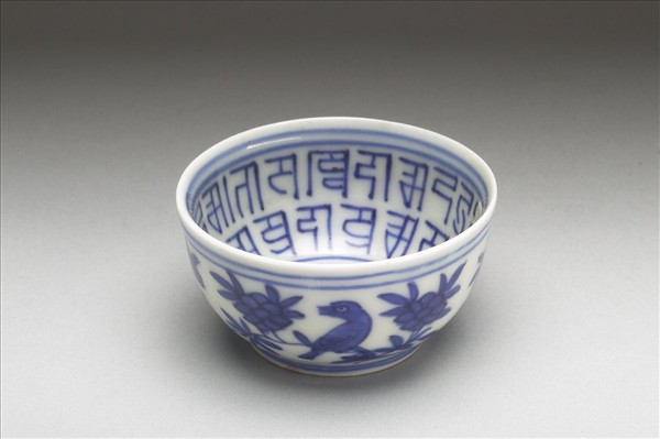 本器為小杯,斂口,壁呈弧形,淺圈足,外壁繪青花花鳥,內壁以青花書梵文,底有「大明萬曆年製」青花楷書六字款。從器底「大明萬曆年製」款識的寫法來看,可能屬清代仿製。
