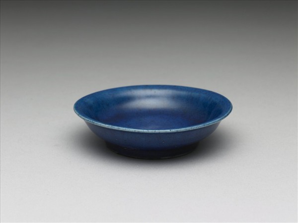 本器為小碟,圓口外侈,弧形壁,有圈足,外壁施霽青釉。底有「大明嘉靖年製」雙圓框陰刻楷書六字款。從器身的霽青釉色和器底的「大明嘉靖年製」款識來看,應屬明嘉靖時期作品。
