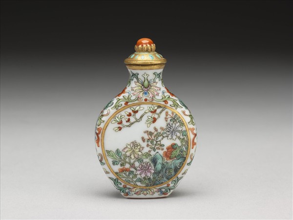 模製扁壺兩面開光彩繪玉蘭、海棠及牡丹,象徵「玉堂富貴」,其餘白地間飾番蓮纏枝紋。帶描金彩繪瓷蓋與牙匙。底有篆書「乾隆年製」紅款。原貯於華滋堂燕喜堂中,共41個鼻煙壺貯於一楠木箱中。