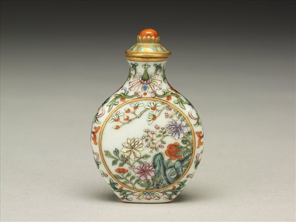 模製扁壺兩面開光彩繪玉蘭、海棠及牡丹,象徵「玉堂富貴」,其餘白地間飾番蓮纏枝紋。帶描金彩繪瓷蓋與牙匙。底有篆書「乾隆年製」紅款。原貯於華滋堂燕喜堂中,共41個鼻煙壺貯於一楠木箱中。