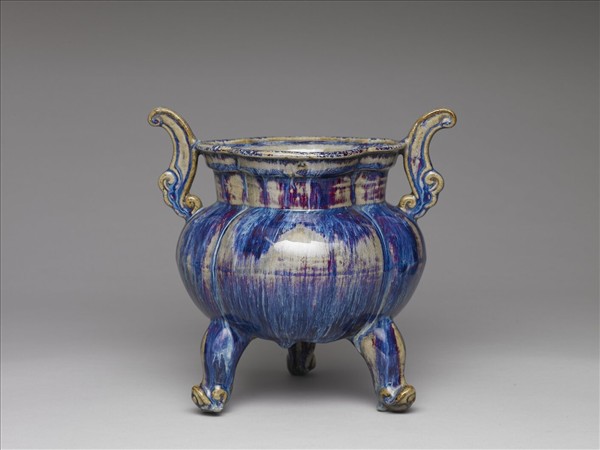 海棠口,短頸,圓腹,雙雲形耳,平底,三足。全器施爐鈞釉,藍、白、 紅三釉色呈不均勻分布,腹部下緣及足部內側有流釉及縮釉痕跡。外底施護胎汁呈褐色。