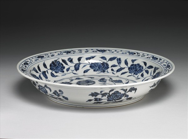 侈口,折沿,淺壁,平底,圈足。以青花繪製圖紋,口沿有一弦紋,折沿內繪卷草靈芝紋,內接兩道弦紋,壁內繪卷枝牡丹,內底為八瓣花雙線框,內繪菊花團花紋;折沿外側內外邊各繪一道弦紋,外部繪六朵折枝牡丹,平均分列,底部下緣及圈足各有一道弦紋。底塗褐色護胎汁,無款。