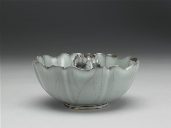 八瓣花口形碗,弧形深壁,矮圈足,無底,加鑲一層金屬底足。器內形塑出一個凸起的蓮房,中心開通,下設六孔,頂端加鑲一個花形金屬釦,周旁貼飾浮萍與茨菇葉各兩枚。胎體較薄,內外施青釉,釉色微泛灰。口下有多層施釉痕,口沿釉薄處露出深灰色邊及胎色。釉面出現稀疏開片紋。 浙江省杭州市老虎洞窯址也曾出土同樣使用模製成形技法完成的多瓣花口碗。由於造型奇特,而不免令人對它的用途感到好奇,近來學者透過德國柏林亞洲藝術博物館收藏的一件白瓷盞,藉由碗內相似的結構,推測此件作品的中央部位,原來應配製有模製小人物。注水入碗後,水浮力的推波助瀾,讓碗內小人物得以緩緩升起,形塑出對飲的趣味。堪稱是深受北宋以來科學氛圍影響下,利用虹吸原理完成的特殊酒具。
