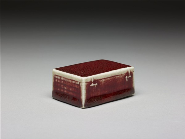 長方小箱狀,平頂可擱放墨錠。側壁繪藤竹編織紋,前有二繫紐。中空,底有四支釘痕井一小圓孔以通氣。全器滿罩鮮紅釉,釉色流動,呈寶石紅、蘋果青色調,周稜色白。器帶檀香木座。