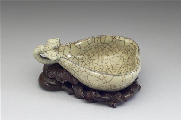 瓢瓜半剖形水匜,瓜蒂處有兩片平展的小葉,蒂向下捲曲成環形把手。全器施灰青色釉,釉質不透明,表面佈滿深褐色開片。外底平整,有三枚支燒點,露黑褐色胎。