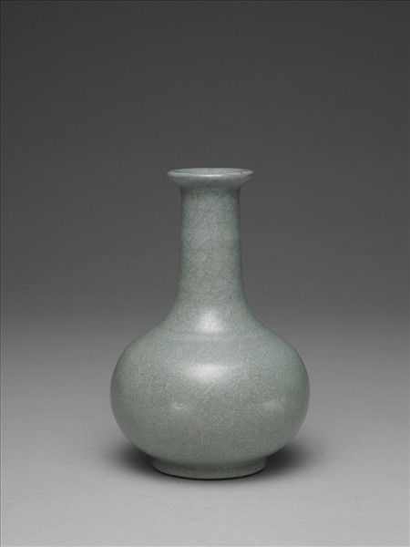 圓口窄邊,長頸,碩腹,平底,矮圈足。頸腹飾弦紋,因施青瓷厚釉,以致模糊難辨。釉表開細密淺色紋片,施釉至足際,足緣無釉,露胎處加塗灰黑色護胎汁。底面鐫刻乾隆皇帝〈詠官窯小瓶〉,詩中所謂島瘦與郊寒,乃是乾隆皇帝透過器表釉色所散發出來,足以和唐朝詩人賈島與孟郊詩中孤寂、蕭瑟意境連結的質感,抒發他個人獨特的鑑賞觀。