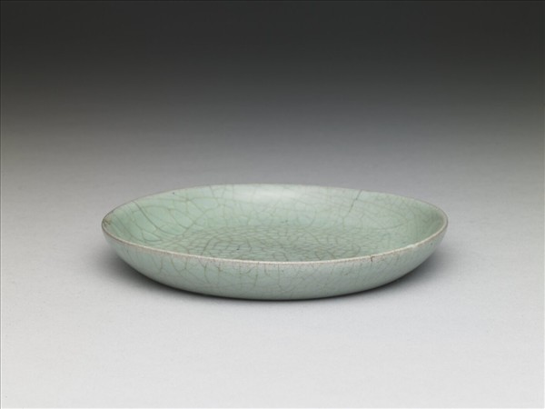 圓口,淺壁,平底無足。胎質較薄,滿釉支燒,通體施青釉,釉色粉青微泛綠。底面三枚支燒點沿邊排佈,正背兩面滿佈開片,中心後刻「蔡」、「丙」兩字。與之相似的器形,亦見於河南省寶豐縣清涼寺窯址出土的標本。