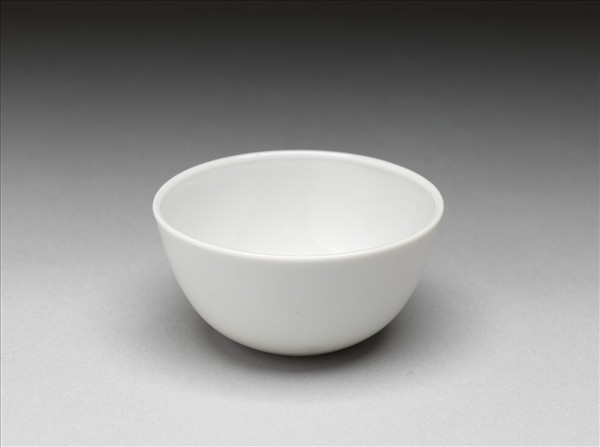 小杯,斂口深壁,平底,凹足。全器表面光素,白釉無紋。器底青花書:「大清雍正年製」。