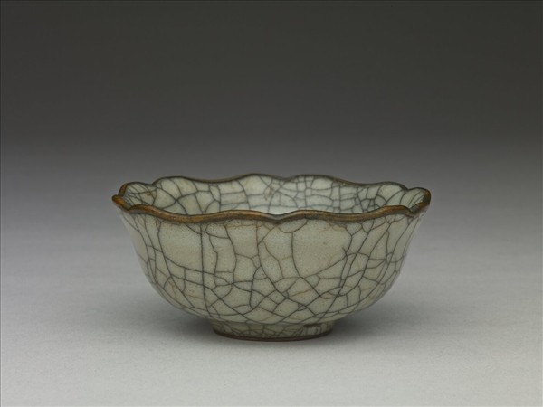 葵花口,深壁,平底,矮圈足。胎薄釉濃,釉面有沙眼,紋片清晰。足底塗赭色汁,口鑲銅邊。