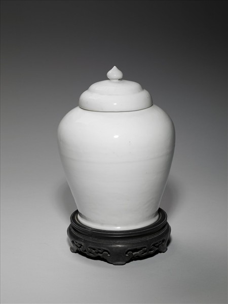 直口,短頸,鼓肩,斂腹,下略外撇,凹足,帶寶珠鈕階形蓋。全器施白釉,略帶青色,釉色圓潤,足底露胎,呈白色。附鏤雕卷草紋如意雲足座。