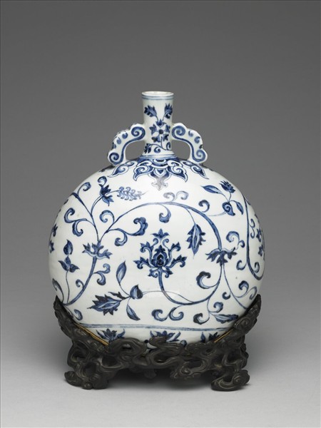 直口,細長頸,圓肩,扁圓腹,平底,雙雲形耳。全器以青花繪製圖案,頸部飾花葉紋,腹部飾轉枝番蓮紋,腹部下緣飾折枝花葉紋,耳部繪如意點,口沿、頸部下緣、腹部下方及邊緣皆繪有二至三道弦紋,足底露胎成灰褐色。附鏤雕雲紋木座及錦墊一只。