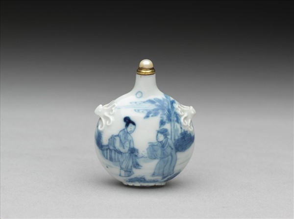 青花人物雙繫扁壺式鼻煙壺,獸首雙繫扁壺,雙面繪西廂人物故事,底有楷書「雍正年製」,帶銅嵌珍珠蓋,附有寶藍繡菱格錦囊。