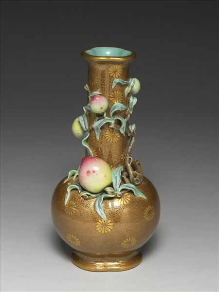 長頸瓶呈三瓣桃形,碩腹、矮圈足,模製成形。淺褐色器身描繪金色卷雲紋錦地及纏枝菊花;圈足則繪六瓣朵花。瓷瓶頸部及肩上攀附著五顆粉嫩的蟠桃及一叢紅、紫、褐色的靈芝。在紋飾上,無論是蟠桃、靈芝或菊花皆具「壽」的吉祥寓意。器底印「大清乾隆年製」篆書款。褐色的瓶身,以金彩描繪菊花的特色,令人聯想到日本的蒔繪漆器。
