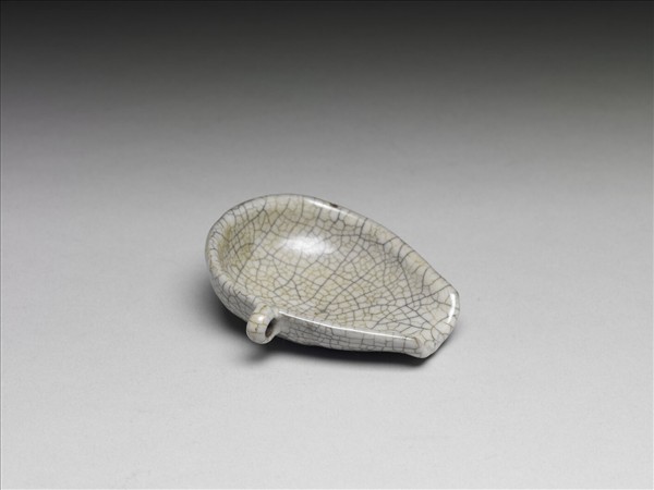 瓢形,敞口,淺壁,圓底,有流,單側有環耳。全器施青釉,有粗疏開片紋,呈褐色或黑色。附木座。