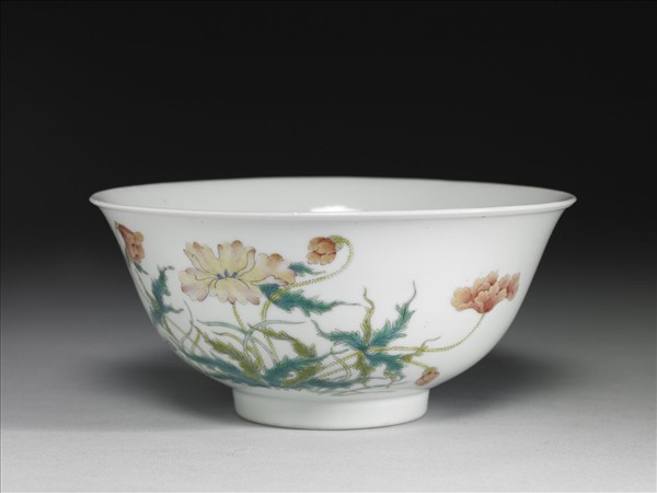 微撇口,深壁,平底,圈足。外壁以五彩釉料繪圖題字,一面題有「合芳如有意,呈彩亦當時」,前有紅彩陽文「佳命」方框章一;另一面繪製芙蓉花及菊花紋,有福壽之意,圈足繪一圈褐色弦紋。底有紅書「洪憲年製」四字雙行楷款,與故瓷18339為一對。