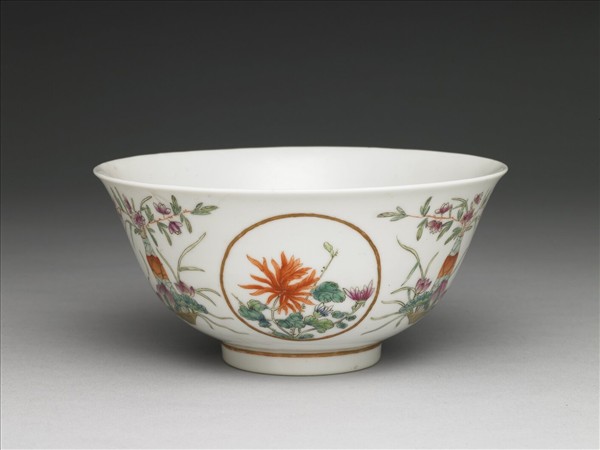微撇口,深壁,平底,圈足。外壁以五彩釉料繪圖,有三圓形開光分列三面,褐色邊框中各繪菊花紋,四瓣花,芙蓉花及月季。開光隙地繪一瓶中插桃花,前有一籃放置蓮花及桃實;碗心繪一折枝桃花,圈足繪一圈褐色弦紋。底有紅書「洪憲年製」四字雙行楷款,與故瓷18340為一對。