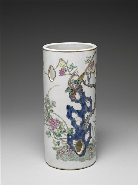 直口,筒形,平底,凹足。以五彩於外壁繪製圖文,一綬帶鳥立於湖石之上,旁有牡丹、玉蘭花、菊花及蝴蝶,表示福壽之意,有六個四瓣花形孔洞。底有紅書「慎德堂製」四字二行楷款。