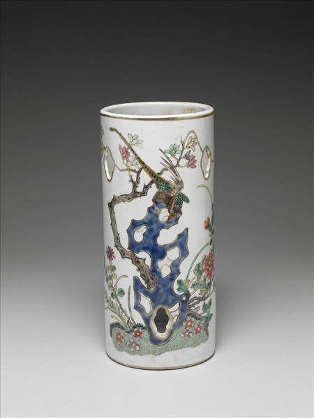 直口,筒形,平底,凹足。以五彩於外壁繪製圖文,一綬帶鳥立於湖石之上,旁有牡丹、玉蘭花、菊花及蝴蝶,表示福壽之意,有六個四瓣花形孔洞。底有紅書「慎德堂製」四字二行楷款。
