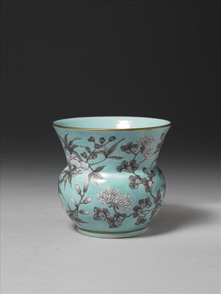 渣斗,侈口、寬頸、碩腹、圈足。器內淺綠釉,外壁施玻璃白,再罩綠釉。以墨彩勾勒菊花、秋葵、桂枝及八哥的輪廓及筋脈。花葉留白處,利用深淺不一的墨色渲染,整體生動細緻。口沿描金一圈,下方朱書「大雅齋」一行楷款及橢圓海水雙龍「天地一家春」篆款閒章一枚,底書「永慶長春」四字。帶有此三名款的瓷器,被稱為「大雅齋」瓷器,是慈禧太后為慶祝四十大壽,親自下令製樣,責成九江州(江西景德鎮)燒製的御用瓷器。菊、葵、桂花,意味著三秋獻瑞,充分表現慶壽的吉祥意涵。紋樣取材於生活中的園林花鳥等折枝小景,是當時各家創作的特色,也是太后情有獨鍾的繪畫主題。水墨渲染效果的瓷器紋飾,自康熙時期即有,但以濃烈的粉彩為地,用色跳脫傳統的拘束,整體呈現強烈的對比色,則為太后獨特的品味。此批瓷器經過慈禧太后的精心檢視,成為晚清精緻且具個人品味的皇家用瓷。