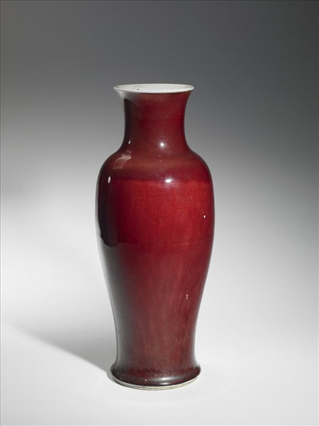 侈口,短頸,圓肩,腹上直下內收,凹足。器內施白釉,器表施銅紅釉,釉色紅,尚均勻,近足處有積釉現象,器底施白釉,足底露胎。
