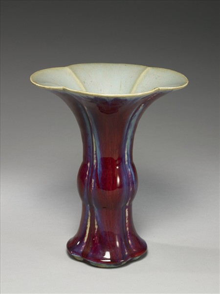 海棠形,撇口,長頸,鼓腹下外撇,海棠形圈足。通體施爐鈞釉,呈紅、靛、紫、月白等多色深淺混雜流動窯變釉,口內與雲形板耳則多作淺月白藍色。器底施醬釉,底心印「大清乾隆年製」六字三行篆款,圈足露胎,塗赭色汁。仿鈞窯變釉為雍正時出現的新品種,乾隆朝仍沿續燒製,仿鈞釉色,採多次施釉,燒成過程中,不同金屬元素自然結合。所產生的流動窯變釉色,一般偏紅者,稱「火焰紅」。