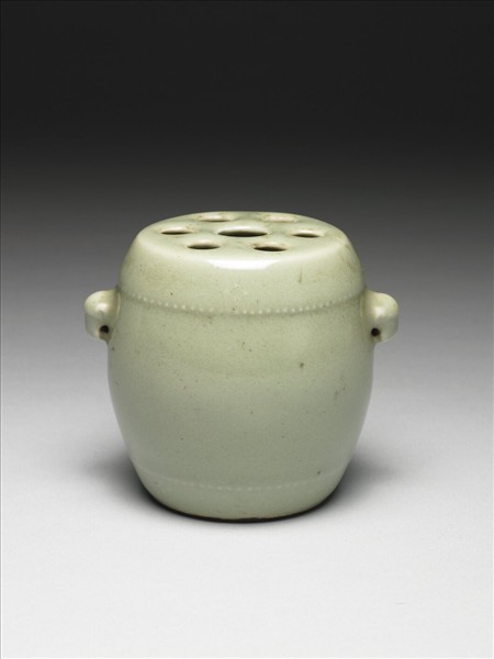 鼓形,平頂,圓腹,凹足,雙環耳。頂上有七孔,中間較大,周圍六孔較小,腹部上下緣各有一排點狀紋,全器施青釉,呈冬青色,足部露胎,兩側塗護胎汁呈黑色,足底呈白色。