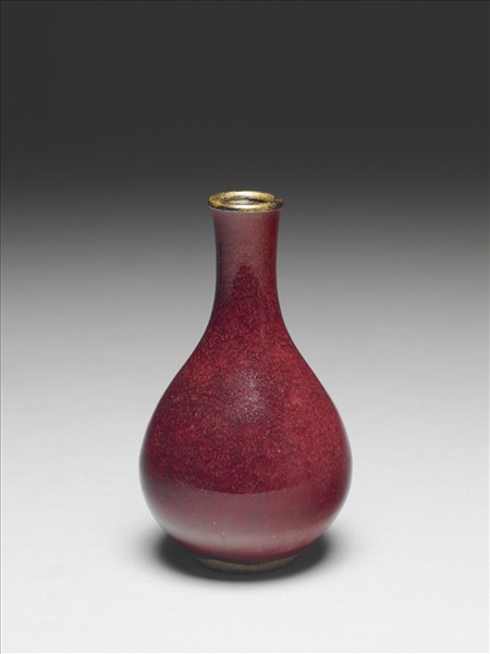 小圓口,口略侈,長頸,碩腹,圈足。口緣銅扣一圈,外壁滿施霽紅釉,釉面有細微沉澱凸起,凸起處色較深。足露胎一圈,露胎上有修整時留下的細密弦紋。足內白釉無款。