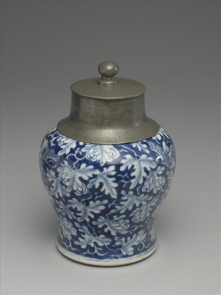 唇口,短直頸,豐肩,腹部上豐下斂,足外撇淺圈足,足圈內削,足牆外高內低,帶錫製撇口蓋(故瓷018387-N2)。器身紋飾留白,青線描繪佛手瓜及對蝶紋,餘隙地均以青花填地,青地勻濃有色階之分,由於青地釉色厚薄不均,形成釉面凹凸不平,罐內、內外底及露胎足圈均見鏇坯遺痕。器無款識,然以釉色、造型以及紋飾特徵以觀,應屬清盛世時期作品。器蓋為錫製,平頂,雙階寶珠形鈕,直壁外撇,蓋內有一短牆圈沿,蓋內底印有作坊名稱及押花印,花印一為蓮花,一為月季花,兩花印右為「內西華門」;左為「金□號製」,應該是西華門內商家作坊店名。 這類罐形一般稱「將軍罐」,帶有原瓷蓋,明末清初大量外銷歐洲,福建碗礁一號沈船即出水不少各種大小尺寸的將軍罐。蓋罐大者作為陳設擺飾,小者則作容器使用,亦有作為儲放茶葉者,此罐口沿並無錫扣,而是直接將器蓋作成撇長沿,套合覆蓋器肩,殊為特別。瓷器另加錫蓋或金木等材質器蓋者常見於清宮各類茶器上,類似作法亦見於外銷日本的煎茶道瓷茶葉罐上,而前朝器物後配附件亦為清宮常有現象。