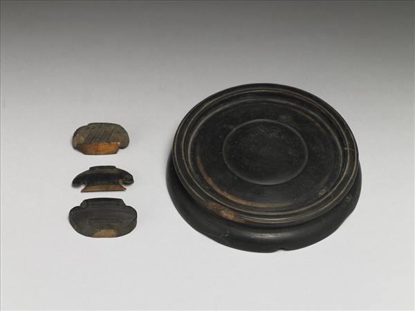 深棕色圓形木座,上層為一圓碟,刻有數道弦紋,下層邊緣刻花邊。木座腳缺一斷一。