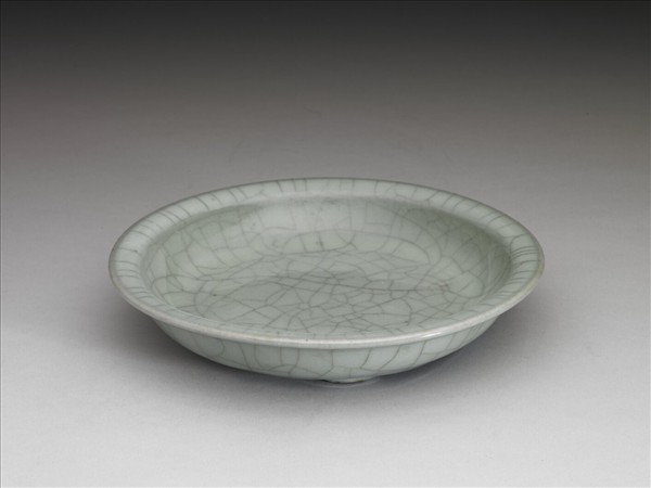 圓瓷盤,侈口,折沿,周壁極淺,平底,帶四矮足。全器通體施青釉至足際,釉色微灰,表面帶清晰開片。