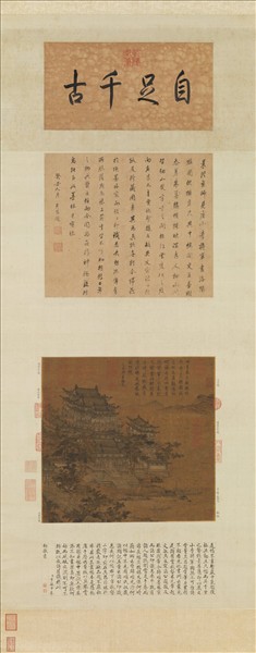 此圖為中軸對稱建築群組合,樓閣交互,精整有序。主殿為二層重檐歇山頂,四周有平坐圍廊,屋頂前低後高錯落,用勾連搭的做法。(將三座房屋沿進深方向連接起來,中間不做隔牆,屋頂各自分開,擴大室內使用空間。)下設台基,最前方月台兩側有踏道上下。此圖斗栱繪法簡化以方格重疊,可能是明代人根據畫稿臨摹或改畫的,畫上「李昭道」款係後人添加。