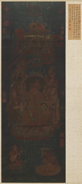 吳道子(?–西元七九二年),陽翟人,玄宗時,召入供奉為內教博士,並為更名道玄。善畫鬼神、鳥獸、草木、山水台閣,尤長於道釋人物。用筆能於東晉顧愷之以來,流行之鐵線描外,別創蓴菜描法,故衣紋有臨風飄蕩之勢。著色則採淡暈薄罩的淺染法,時稱「吳裝」。開後世人物畫典則,被尊稱「百代畫聖」。此像即世所謂北方天王,為盛唐以後最受尊奉之佛像之一。