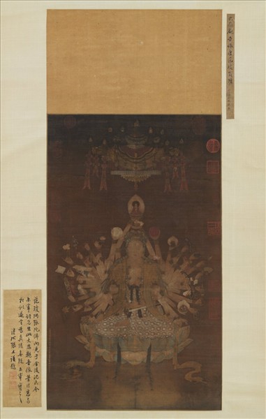 觀音菩薩頭戴寶冠,寶冠中畫阿彌陀佛,在青色蓮台上結跏趺坐。祂有三隻眼睛、四十二隻手,每隻手掌中間還畫一隻眼睛,是密教中千手千眼觀音(又稱大悲觀音)的一種類型。本幅右下方有范瓊(活動於八四六-八七九)的題款,雖然清代的查士標和張丑都認為這是一幅范瓊的真蹟,可是這幅觀音女相的造形與唐代的男相觀音不同,反而和明代的觀音較為接近,所以推測它可能是一件明代的畫作。