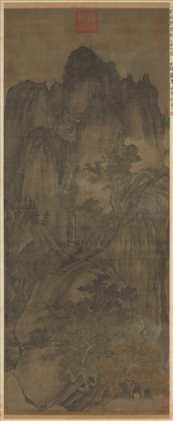 關仝(十世紀中葉),陜西長安人。畫山水師荊浩,而有出藍之譽。所作多關陝一帶景致,雄渾峻拔。論者謂:「筆愈簡而氣愈壯,景愈少而意愈長。」唯不善人物,畫中點景,多由胡翼代筆。本幅無名款,今名係據王鐸跋語而訂定。畫嵯峨高峰,中有泉瀑迂迴,景境幽深。邊角似經裁切,原作或為一屏風形式,後再改裝成立軸。鑑於風格、技法與燕文貴(約九六七-一0四四)略近,故時代應可置入北宋中期。