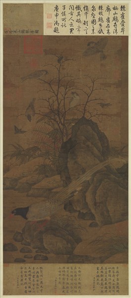 黃居寀(西元九三三年生),字伯鸞,四川成都人。是花鳥畫名家黃筌的兒子,因家學的關係,在花鳥畫方面有很高的成就。他們父子的作品,在畫院中極受推崇, 以致成為畫院評畫的標準。 畫中的鳥鵲與竹石,布滿畫面,空白很少。設色淳厚無華,描法穩健,略帶稚拙之感,有著早期花鳥畫的裝飾意味,及古樸風韻。