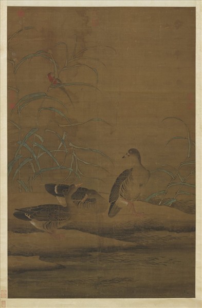 煙水寒汀,雁鳥一縮頸瞑目,狀似睡眠,兩隻引首顧側,若守望警戒。岸旁惟見三五蘆葦,情景蕭瑟,撩人寒思。 黃居寀(西元九三三—九九三年以後),四川成都人,字伯鸞。為五代西蜀名畫家黃筌的第三子,承襲家學,善畫園竹翎毛、怪石及山水。他本任職蜀國,蜀亡入宋,尤得宋太宗禮遇,命他搜訪名畫,評定品目,黃家的畫法遂成為宋初圖畫院較藝優劣的標準。